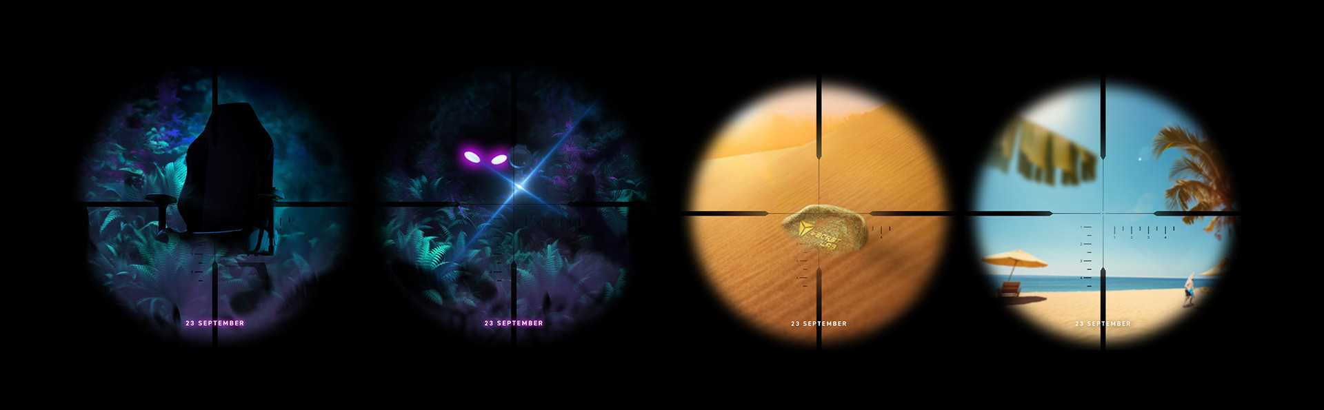 One of the idea that I have came up is to imagine in a night forest setting captures the mystery aura of this intense battle as a sniper, you peering through the scope and seeing the Secretlab chair silhouette with glowing logo, suddenly, as swift movement catches your eye - Raven, hiding within the shadows, taking aim and ready to fire. Continue its quick-panning, with a subtle blurring effect, into a luminous summer scene that unfolds against the backdrop of a golden beach. Here, a banana peel alights upon the sun-kissed sands.
